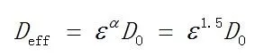 多孔電極中,除孔隙率之外,孔隙迂曲度也是與傳輸特性相關(guān)的一個(gè)重要參數(shù)。有效擴(kuò)散率、傳導(dǎo)率等 Deff輸運(yùn)物性的關(guān)系可用式(3)表示: