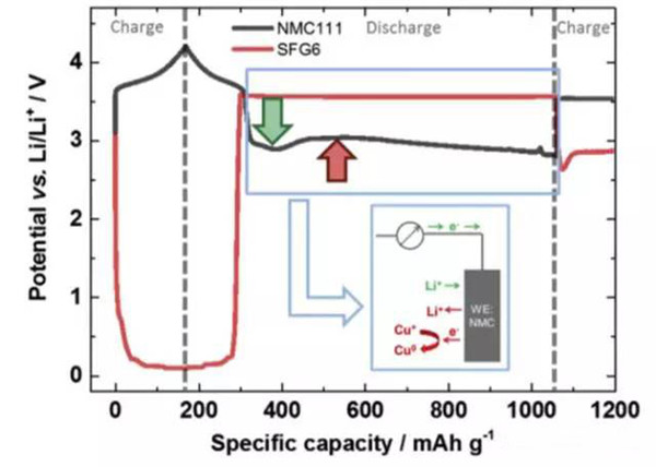 實驗中JohannesKasnatscheew等采用的電池為NMC111/石墨體系,金屬鋰作為參比電極。從下圖a中可以看到,在充電的過程中隨著Li+從正極的脫出,正極的電勢緩慢升高,負(fù)極電勢在快速下降到1V以下,在放電的過程中正好相反,Li+從負(fù)極脫出回到正極,正極電勢逐下降,當(dāng)負(fù)極完全脫鋰后,電勢迅速升高,并在3.56V左右出現(xiàn)了一個電壓平臺,下圖b為該區(qū)域的放大圖,從正負(fù)極電壓曲線上可以看到,正極電壓曲線的變化相對于負(fù)極有大約1h的延遲,隨后正極的電勢也開始快速下降,正極電勢低于負(fù)極石墨的電勢。該電壓曲線變化非常符合銅箔溶解的特點(diǎn),銅箔中的銅元素首先被氧化為Cu1+,Cu1+遷移到正極表面并在正極表面還原,沉積為金屬銅。