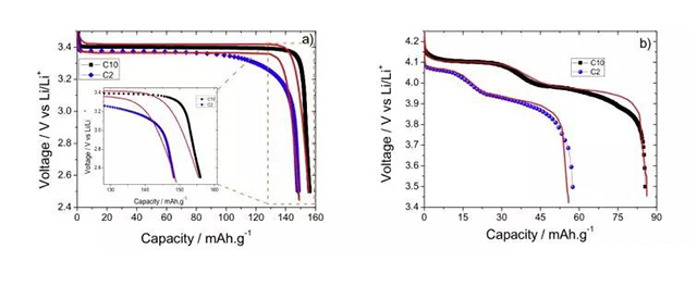 LFP半電池 a)C1=95%在1C、5C和10C下放電容量;b)C1=95%、75%和50%在5C下放電容量