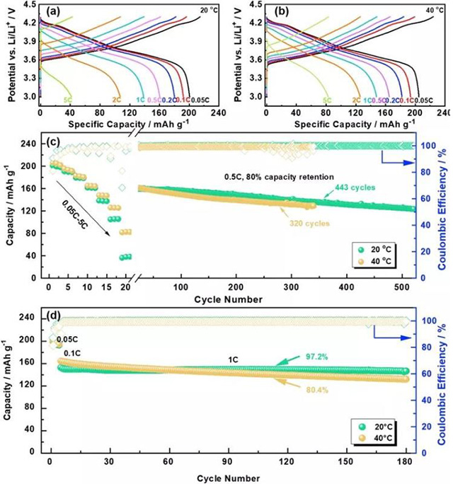在保持電壓范圍恒定的情況下,作者進一步評估了包含SI10-05-70%PC電解液的Li/NCM811電池在20℃和40℃下的倍率性能和恒流循環(huán)性能(圖4)。20℃下,在0.05C首圈充放電過程中,Li / NCM811電池的可逆放電容量為201 mAh g-1(圖4a),非常接近在0.1C下的可逆放電容量。40℃下,Li/SI10-05-70%PC/NCM811電池在0.05C循環(huán)得到更高的放電容量(圖4b),這可能是由于在升高的溫度下電極反應(yīng)動力學增強。但是,由于在高溫下發(fā)生了不可逆的副反應(yīng),在20℃時的首圈庫侖效率比40℃時的高。從第一個循環(huán)就已經(jīng)可以看出,增強的反應(yīng)動力學對容量提升是有利的,但會降低庫侖效率(圖4a-c)。
