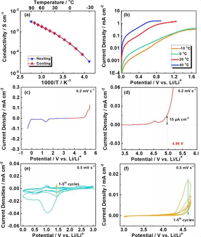圖2:a)SI10-05-70%PC電解質(zhì)的離子電導率隨溫度的變化。b)確定各種溫度下的極限電流密度。c)線性掃描伏安法確定電化學穩(wěn)定性窗口。d)確定氧化穩(wěn)定性。e,f)循環(huán)伏安法研究氧化還原過程。